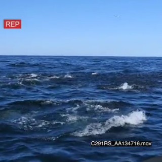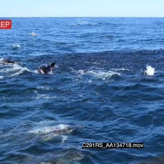 A school of common dolphin and a group of seals swimming, porpoising and feeding from the sardine bait ball TOPSIDE SHAKY GOOD LIGHT