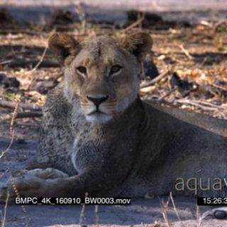 Lioness covered with swarm of flies flying around the face and feeds on them and flicking the flies off looking at the Camera CU