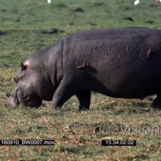 Two hippos Grazing while oxpeckers feeding on the hippo skin