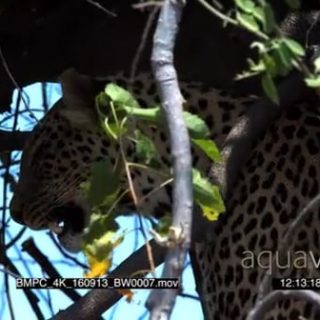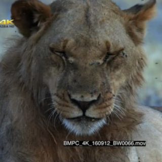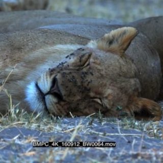 Camera tilt down to a lioness face and shoulders covered in a swarm of flies