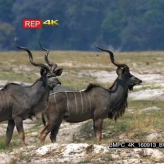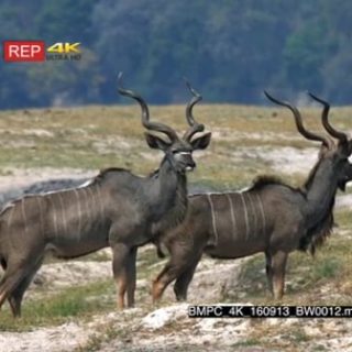 Three male greater kudus with their majestic horns Standing Alert and walks on the grassland