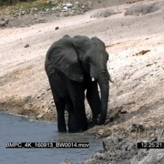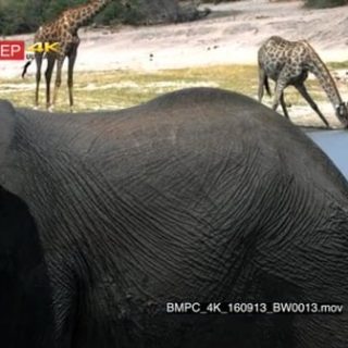 Elephant Splashes its body with mud, two giraffes in the background drinking water