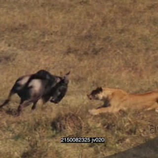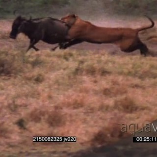 Blue wildebeest defending and trying to escape from a pride of lions TAKE DOWN WS SLOWMO