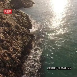 AERIAL Great white sharks hunting patrolling along coastline GOOD LIGHT