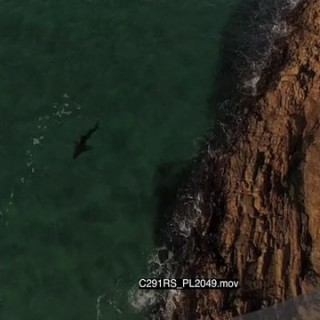 AERIAL Great white shark hunting patrolling along coastline GOOD LIGHT TRACKING SHOT