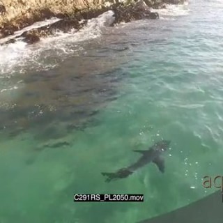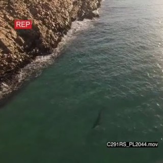 AERIAL Great white shark hunting patrolling along coastline GOOD LIGHT