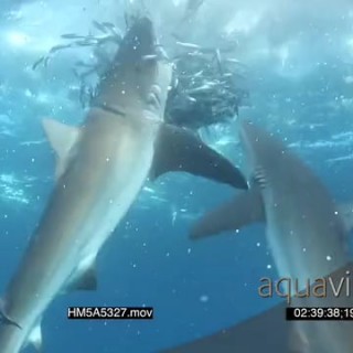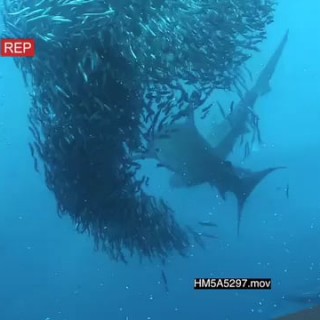 Select options DownloadCape Gannets with Dusky Sharks attacking and feeding on Sardines swimming in a ball underwater in ocean and Skipjack Tunas passing by LA WS HAND
