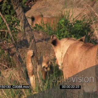 African Lion cubs sitting and moving on rocks in bushveld LS HAND