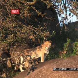 African Lioness standing looking around on rocks with cubs moving LWS HAND