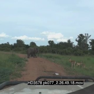 POV vehicle following and stopping near African elephants with juvenile calf walking along dirt road Impalas on side