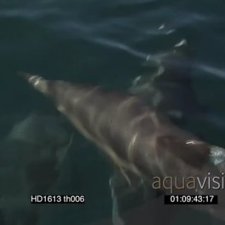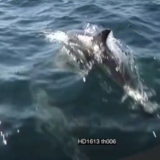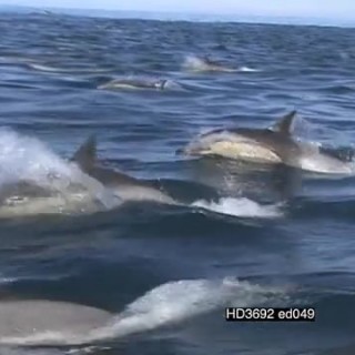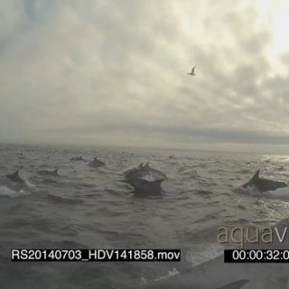 Common Dolphin pod porpoising across ocean above water HANDHELD