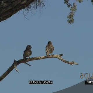 Sociable weaver pair on a tree scouting around others on ground foraging as rest of flock fly around in out of nest chambers