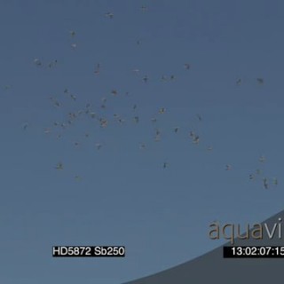 Springboks standing and looking around tilt up to flock of sociable weavers flying