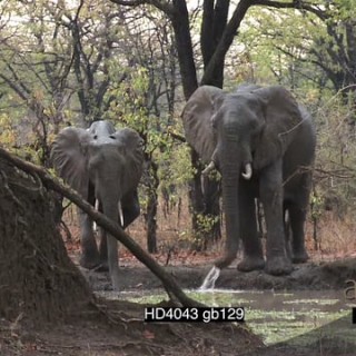 African elephant family with young social behaviour feeding on tree leaves drinking water Cut away’s Luangwa bushveld waterhole in rainy weather