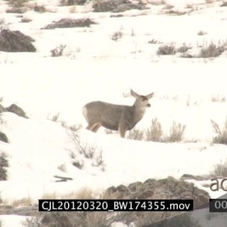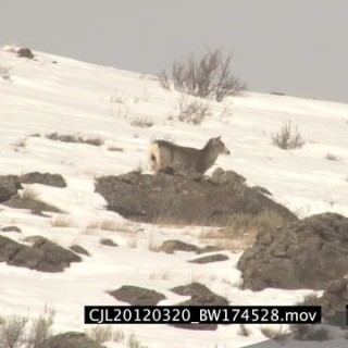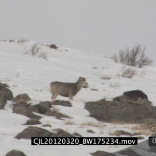 Elk Antelope and Gray Wolf walking and standing on rocky snowy prairie WS
