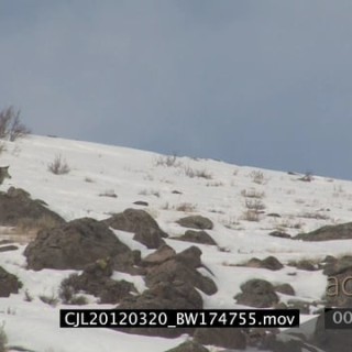 Gray Wolf standing looking around then running after juvenile Elk Antelopes on snowy rocky prairie LS XWS ZI ZO PAN
