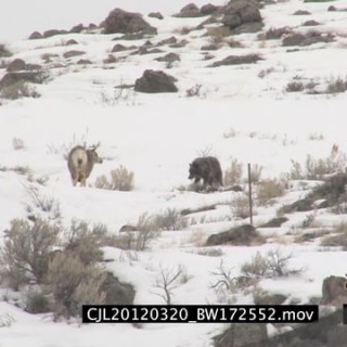Elk Antelope and Gray Wolf standing on prairie during snow fall and intimidating one another WS PAN