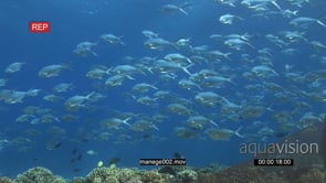 School of Talang Queenfish with Black Triggerfishes swimming on coral reef underwater in ocean passing camera WS TRA HAND