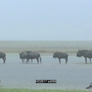 Blue Wildebeest Migration standing and drinking water on flooded plain in the RAIN