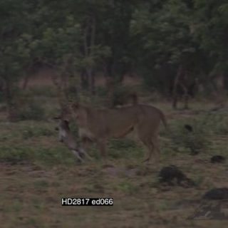 African Lioness sitting and runs off to play and feed on Blue Wildebeest carcass, Playful GREEN