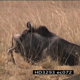Newborn blue wildebeest walking around its laying mother MLS LS