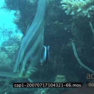 Marlin at cleaning station as Bluestreak cleaner wrasse clean various fishes swimming around past