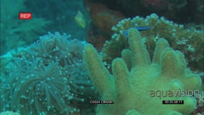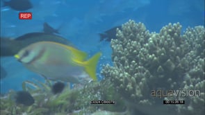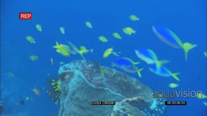 Various fishes getting cleaned by Blluestreak Cleaner Wrasse swiimming along reef