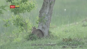 Bobcat walking and looking around on prairie, scratching its body around the tree trunk to mark territory.