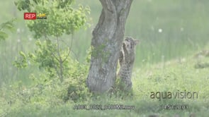 Bobcat sitting on prairie,leaving claw marks to notify its area while looking around then climbs up the tree.