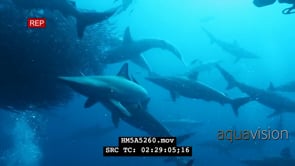 Select options DownloadSchools of Blacktip Sharks and Dusky Sharks swimming underwater in ocean attacking Sardine ball and Divers taking pictures MWS PAN HAND