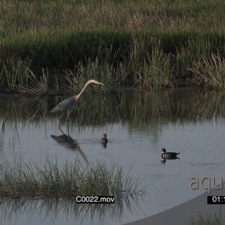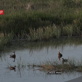 Carolina duck and a flock of Black-bellied Whistling Duck on a dam moving around and a grey heron walking around GENERAL BEHAVIOUR