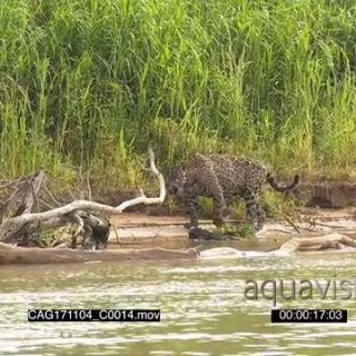 Jaguar (Panthera onca) hunting along riverbank, Capybara swimming away in the Pantanal wetlands, Brazil