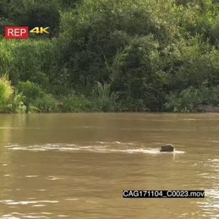 Jaguar (Panthera onca) swimming, hunting along riverbank, Capybara swimming away in the Pantanal wetlands, Brazil