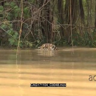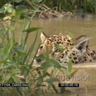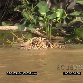 Jaguar (Panthera onca) swimming, hunting along riverbank, in the Pantanal wetlands, Brazil