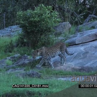Leopard walking from rock to bushveld LS PAN HAND