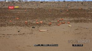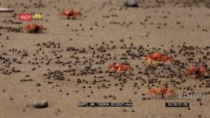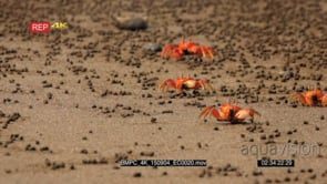 WS shot of feeding red crabs, ghost crab scurrying sideways across Isla de la Plata beach sand