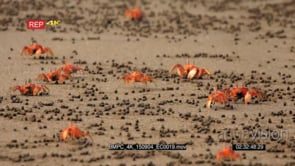 MS shot of feeding red crabs, ghost crab scurrying sideways across Isla de la Plata beach sand