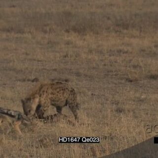 Black- backed jackal sneaking scavenging steal peace of scrap from Spotted Hyenas feeding on carcass remains