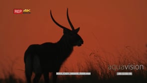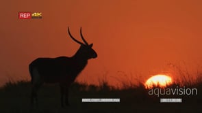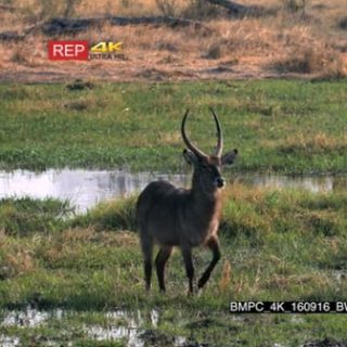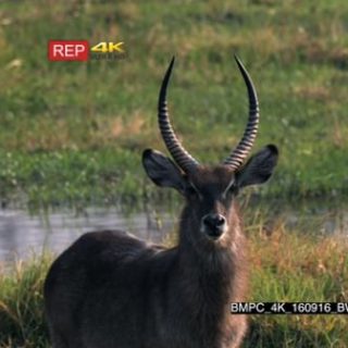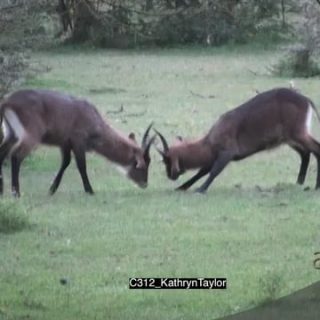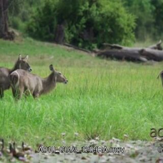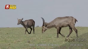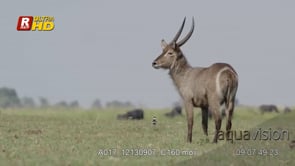 Select options DownloadThree adult Waterbuck back view, looking around, walking and grazing on grass, MWS ;DAY