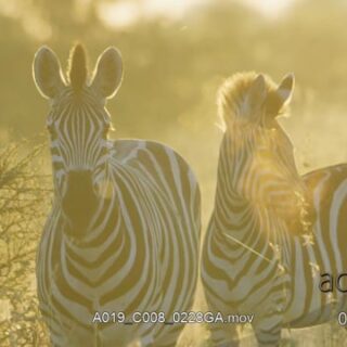 Two Plain Zebra standing, looking towards the camera and walking out of frame.