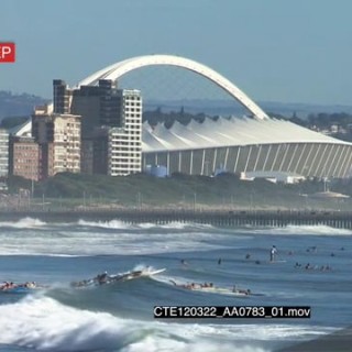 People on surfboards surfing waves Moses Mabhida stadium in BG