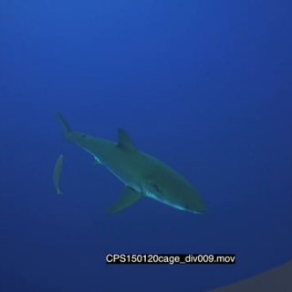 Great White Shark swimming underwater in ocean passing by a group of divers in a shark cages MS PAN HAND