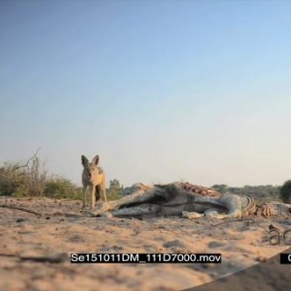 Black-backed Jackal and Vultures feeding on Zebra carcass SUNSET TL