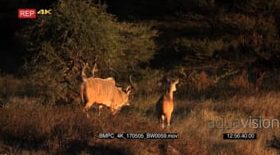 A frisky male greater kudu with its gorgeous horns follows a female around waiting for the opportunity to mate GOLDEN LIGHT