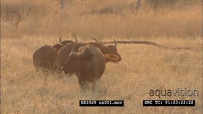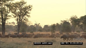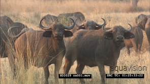 Large Cape Buffalo herd on African plains in golden light WS