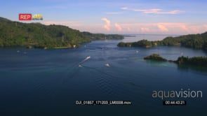 An aerial wide shot where the dive boats head out on Lembeh Strait to the dive sites