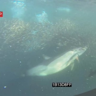 Select options DownloadCommon Dolphins Cape Gannets Dusky Sharks swimming hunting feeding off Sardine baitlball UNDERWATER HANDHELD